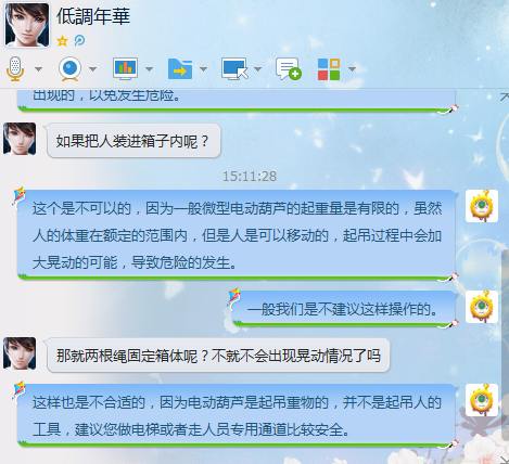 ?  一些的用戶在使用小型電動葫蘆時,會有一些自己的疑問,有的用戶甚至問小編電動葫蘆可以吊人不?下面我們就把詳細的聊天記錄展示給大家。